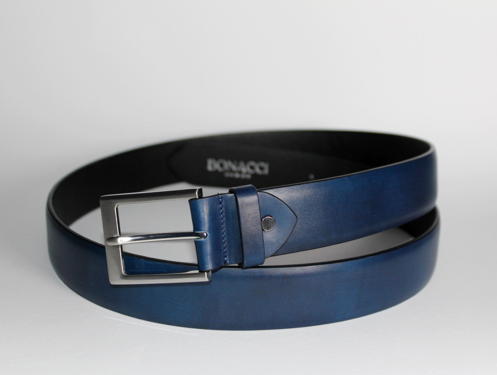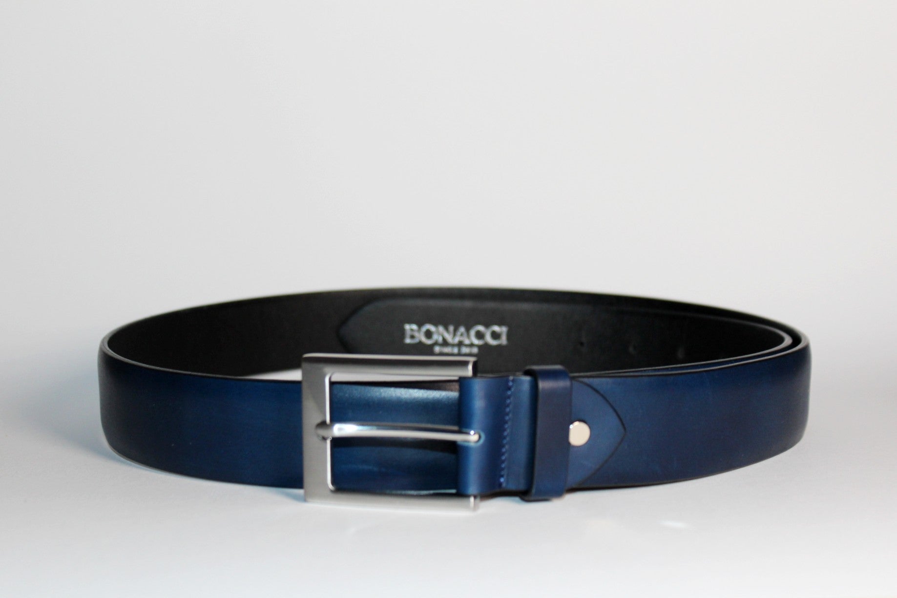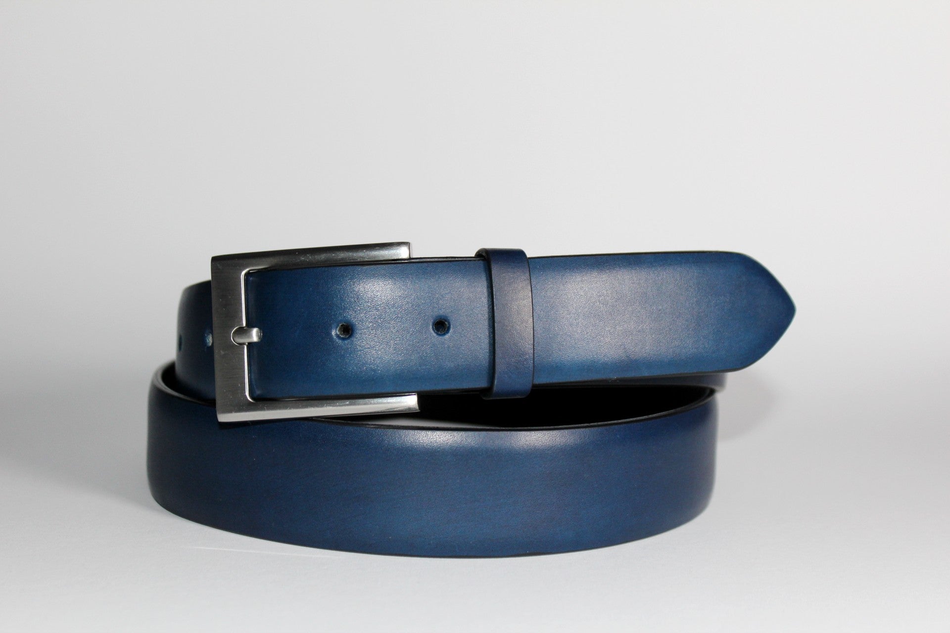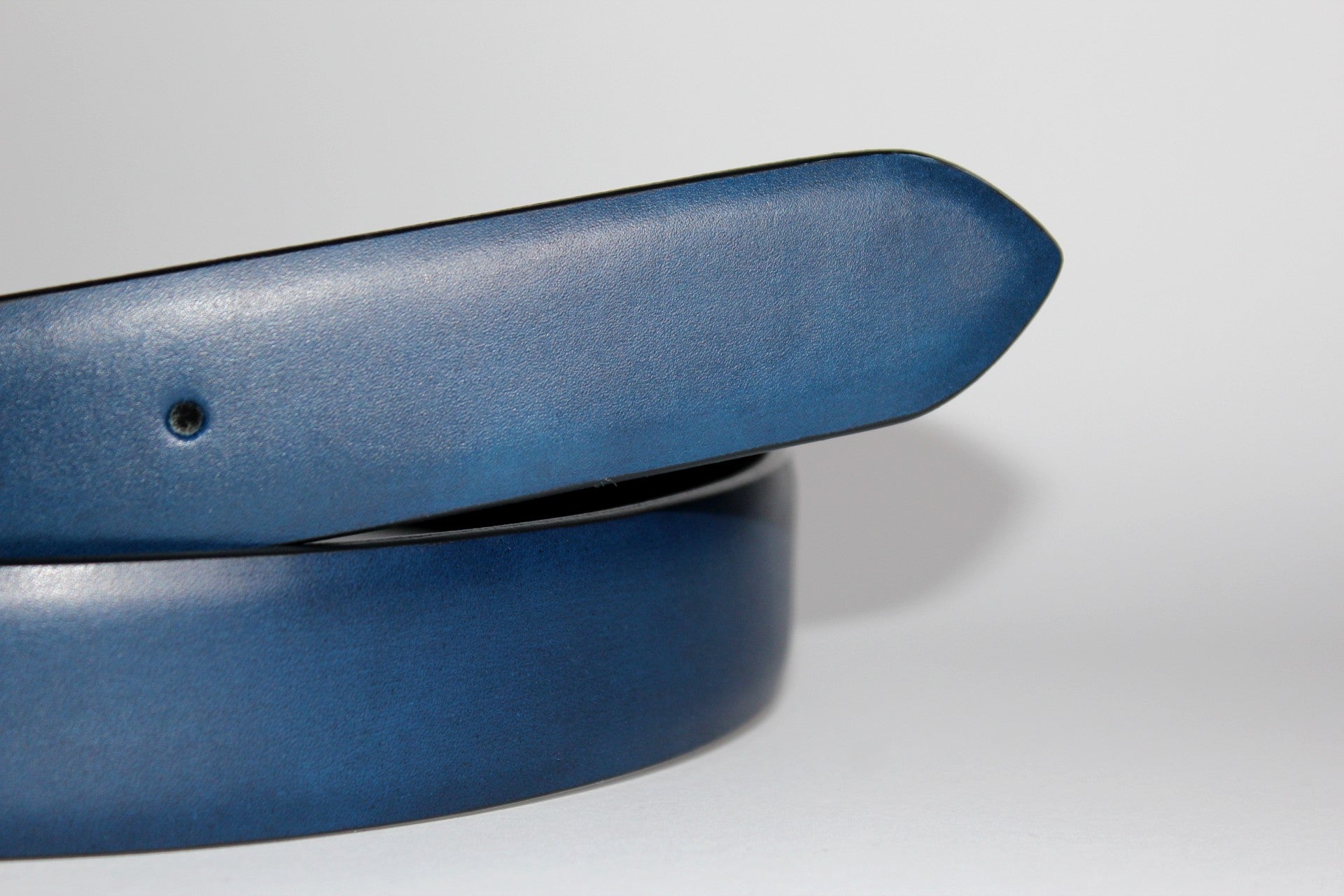 Ručne maľovaný opasok z hovädzej kože v tmavomodrom odtieni so šírkou 35 mm. Farba je nanášaná ručne, vrstvami, čím vzniká hĺbkový tón. Koža má hladký, mierne matný povrch. Vnútorná aj vonkajšia časť sú z hovädzej kože – podšívka je priedušná a má schopnosť absorbovať pot. Osadený prackou z nehrdzavejúcej ocele s lešteným povrchom.