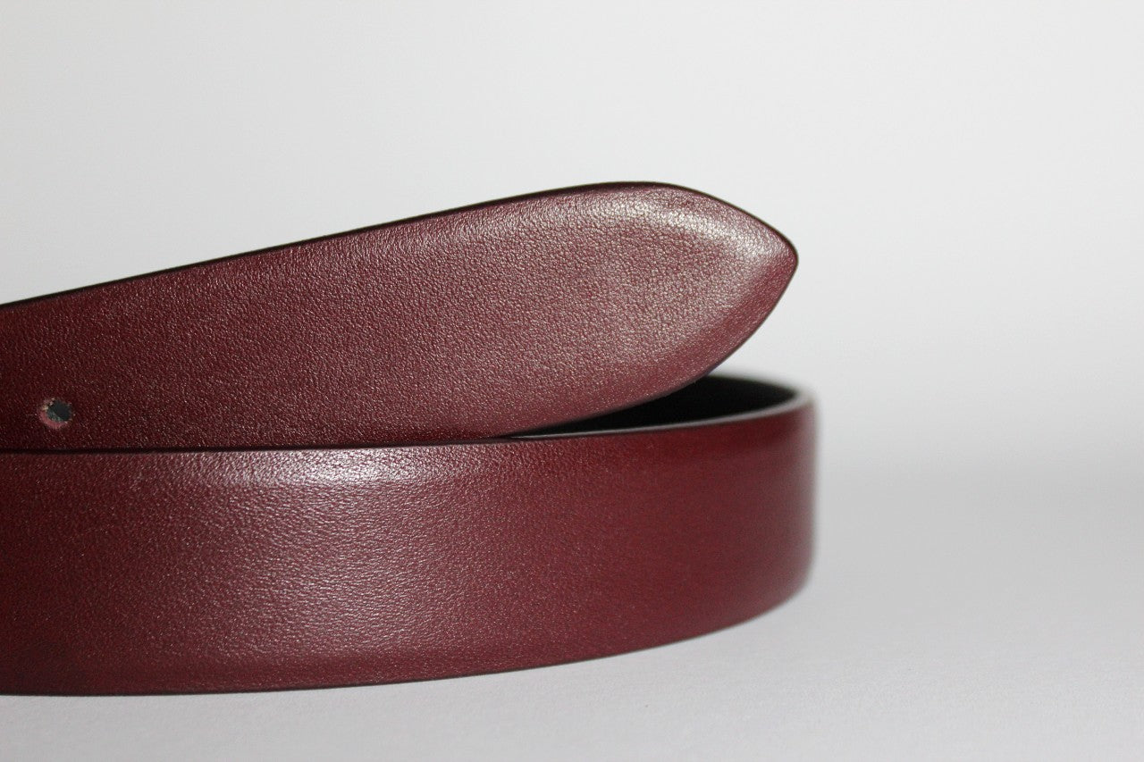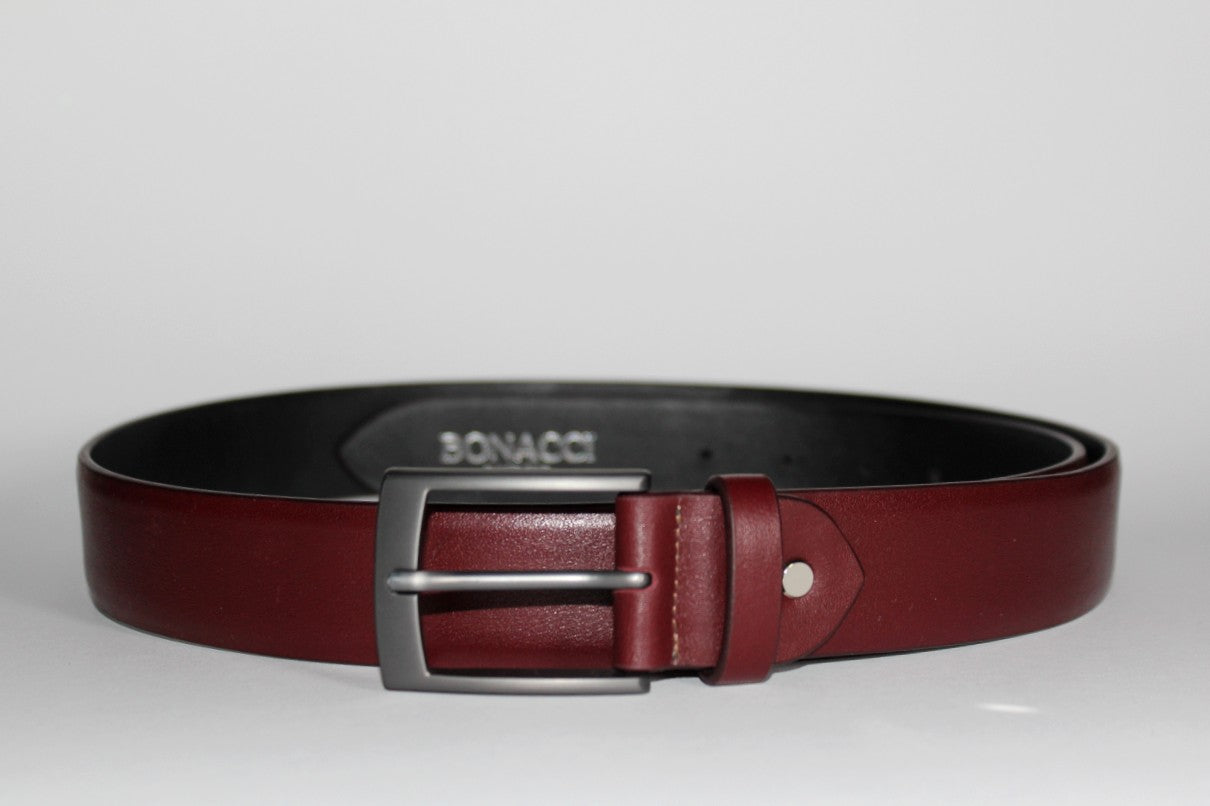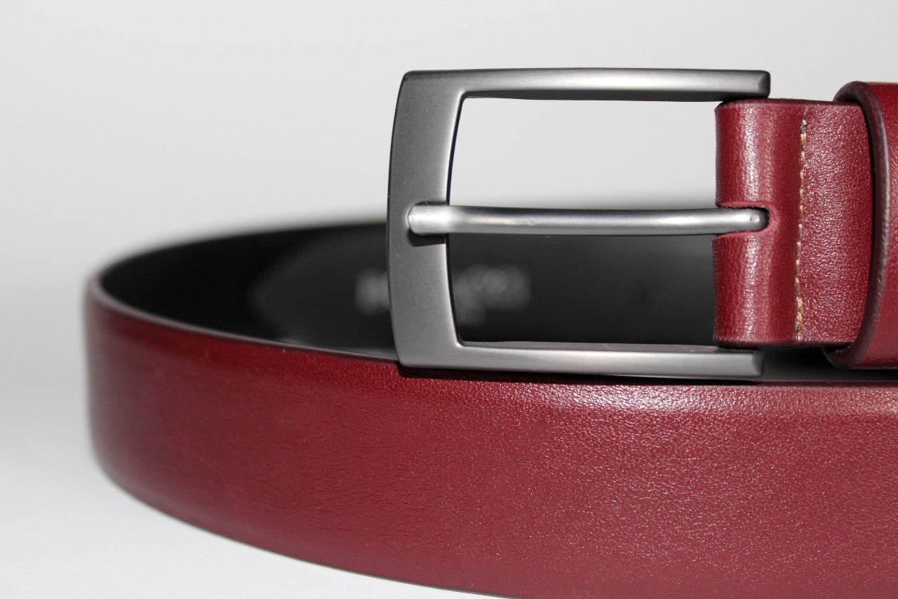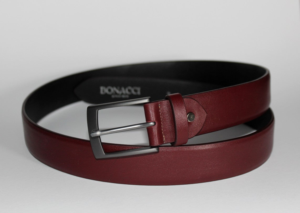 Opasok z hovädzej kože v bordovej farbe so šírkou 35 mm. Povrch kože má jemnú prírodnú textúru a sýty, hlboký odtieň. Podšívka z hovädzej kože s absorpčnými vlastnosťami pre komfortné nosenie. Ukončený polyesterovou niťou v tónovej farbe, bez viditeľného stehu. Osadený prackou z nehrdzavejúcej ocele s tmavou matnou povrchovou úpravou.
