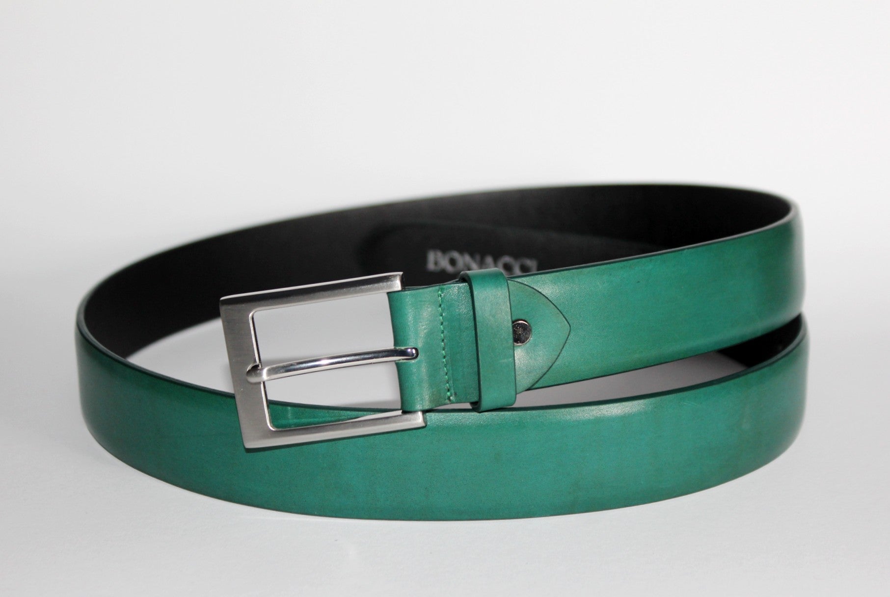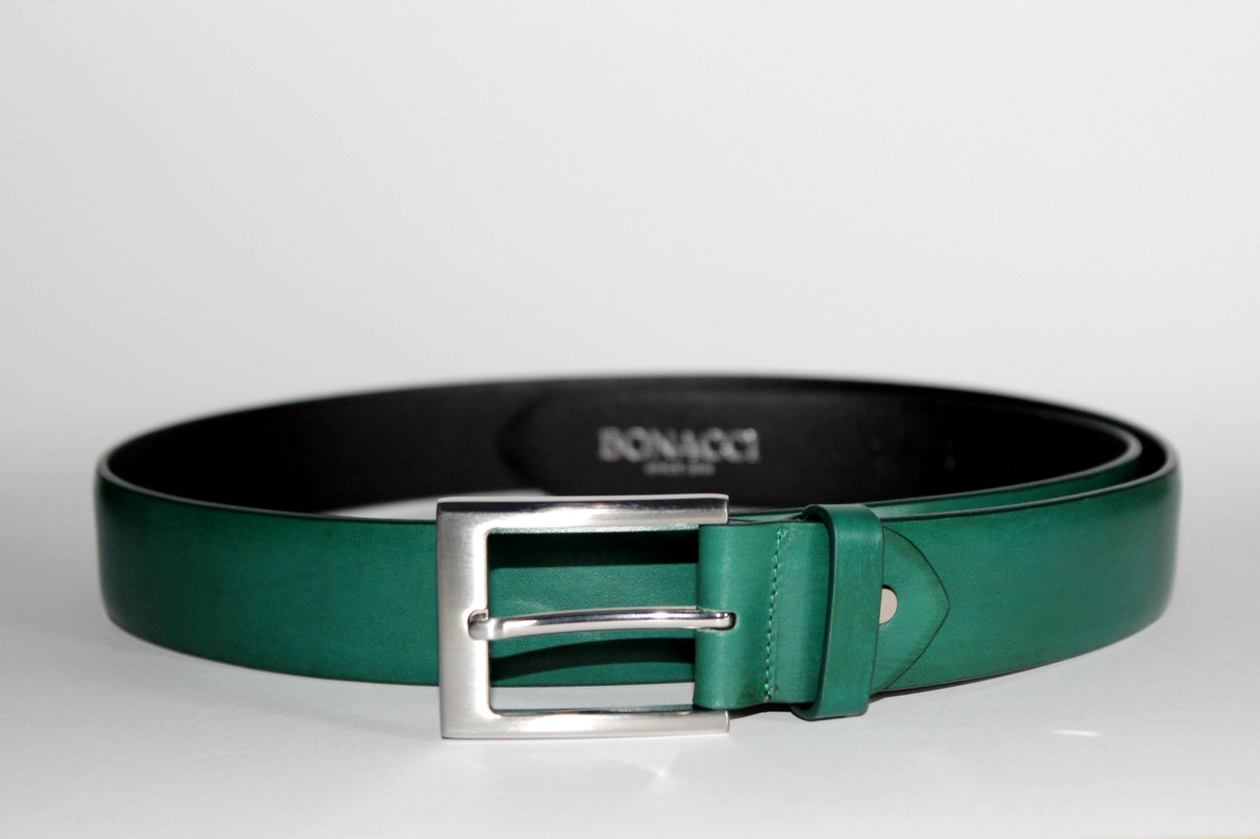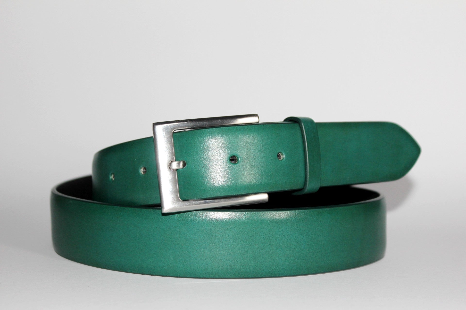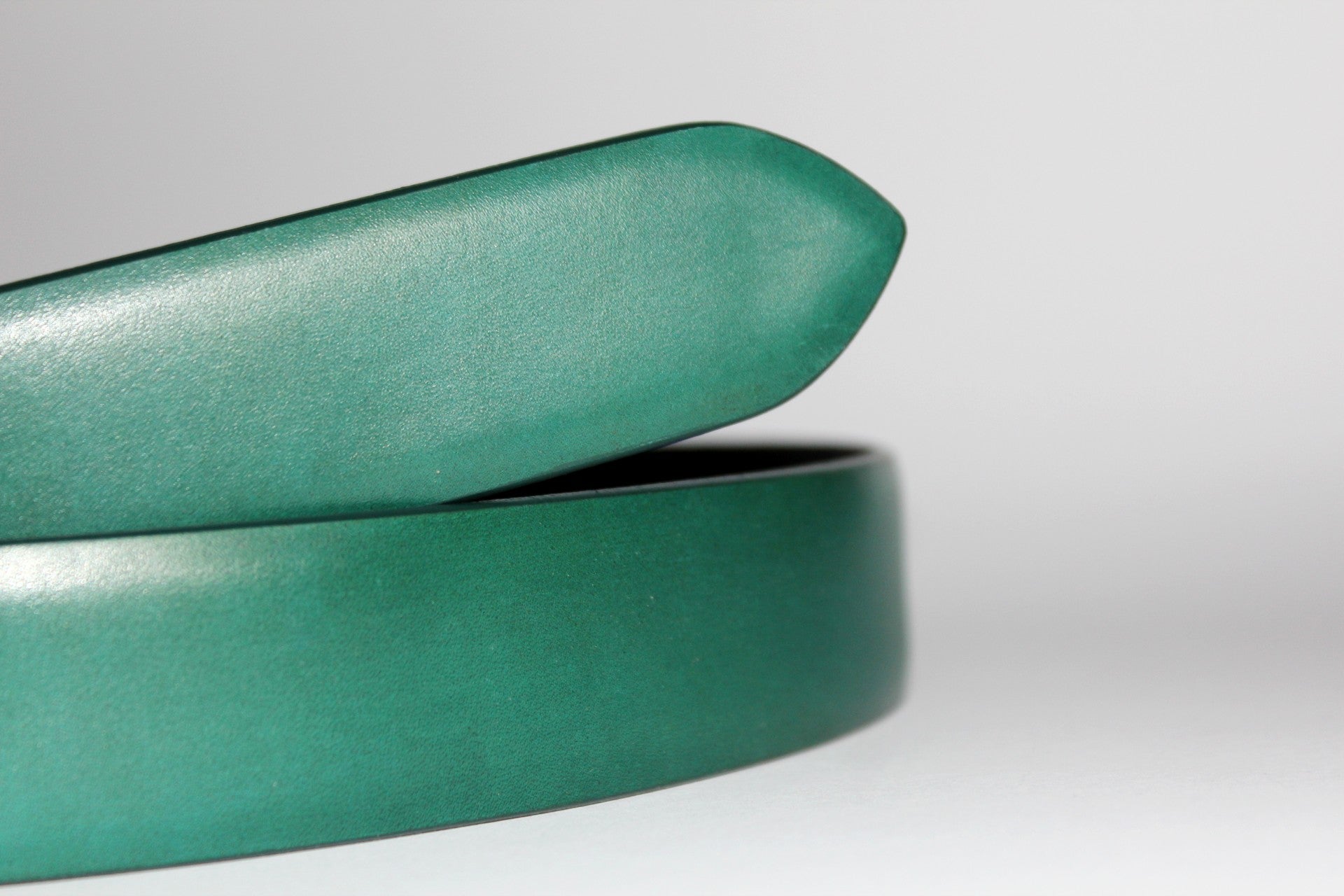 Opasok z hovädzej kože v zelenom odtieni so šírkou 35 mm. Povrch kože má hladkú, mierne matnú úpravu, ktorá zvýrazňuje jej prirodzenú textúru. Opasok je ručne farbený, čo vytvára hĺbku zeleného odtieňu. Podšívka z hovädzej kože a má absorpčné vlastnosti, ktoré zabezpečujú komfort pri nosení. Pracka z nehrdzavejúcej ocele s lešteným povrchom dodáva opasku decentný lesk.